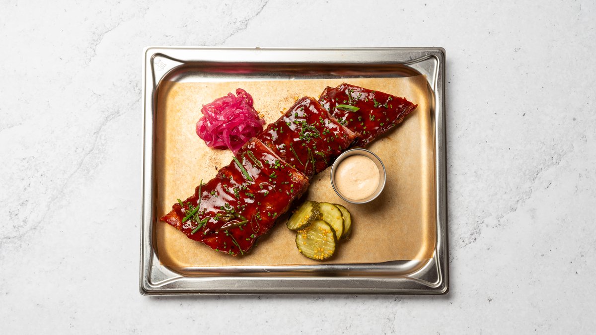 Ribs från alviksgården med Sweet and smocka sås serveras med inlagd gurka och picklad rödlök, pommes och slaw