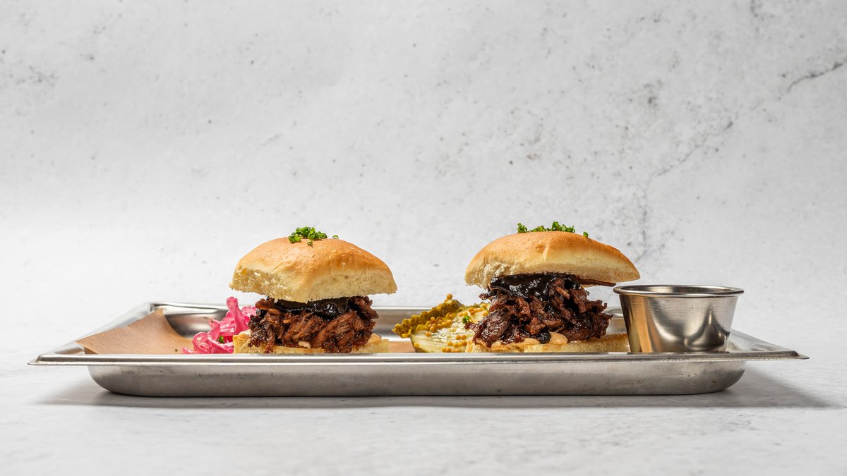 Långrökt och bräserad dragen ren från Norrlandsvilt med slidersbröd, vit BBQ-sås och blåbärsglaze. serveras med inlagd gurka och picklad rödlök, pommes och slaw