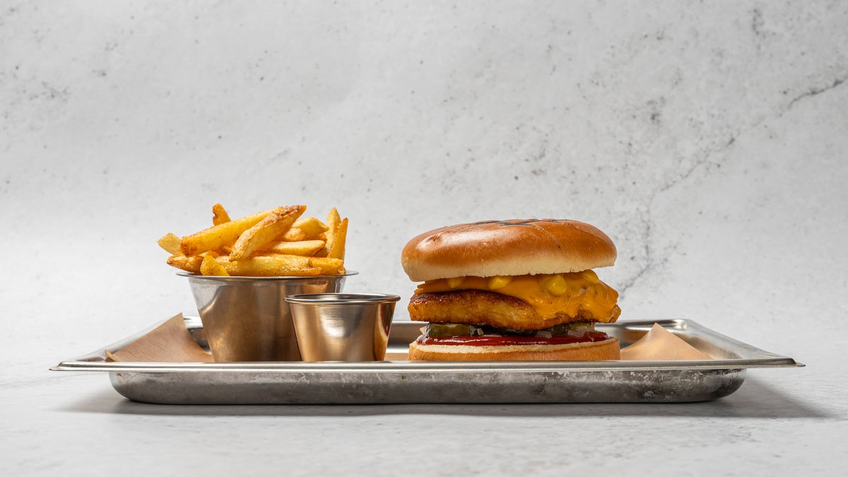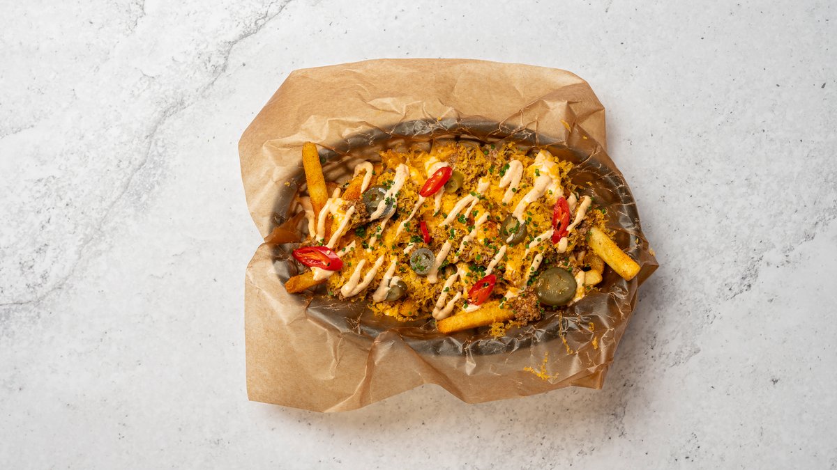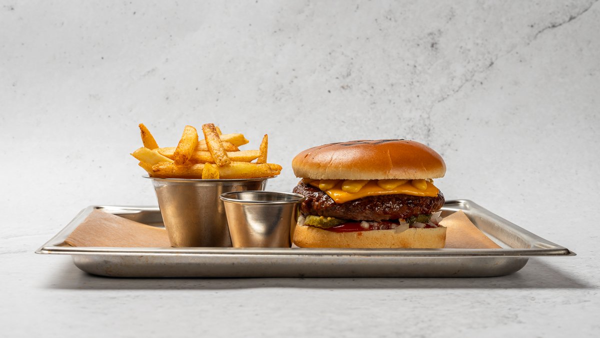 Högrevsburgare*, tryffelemulsion, rökt appelwood ost, picklad rödlök, gemsallad Brioche bröd, Pommes