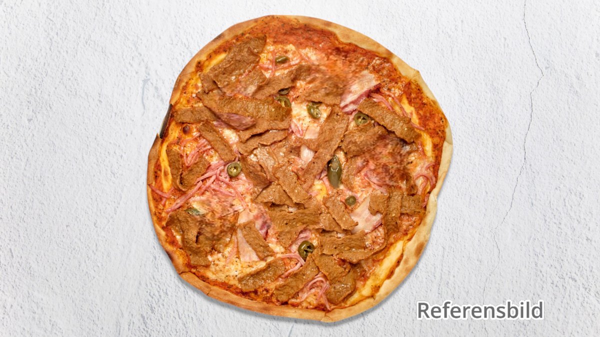 Orientdressing, kebabkött, feferoni, lök, champinjoner, ost och tomatsås.