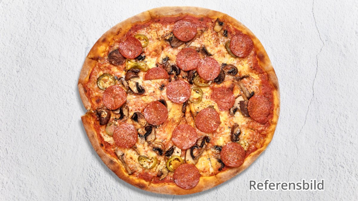 Feferoni, salami, skinka, köttfärs, ost och tomatsås.