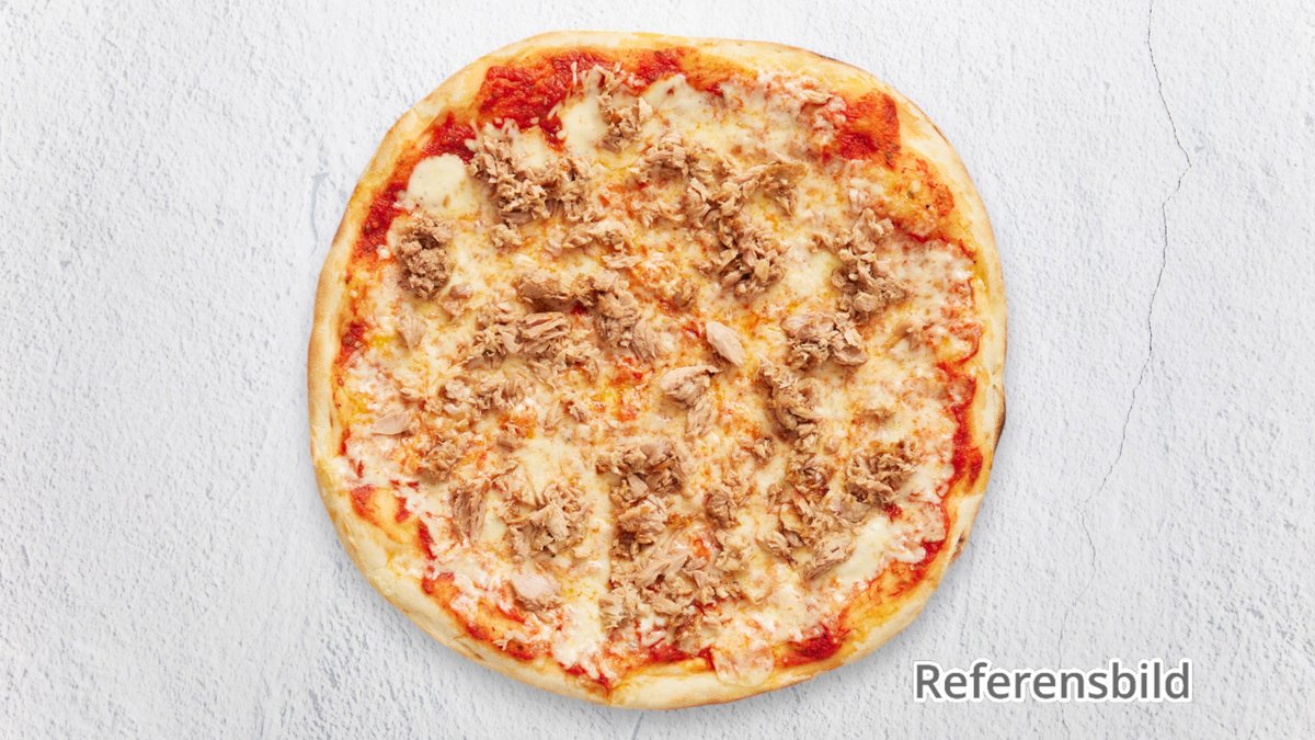 Lök, tonfisk, räkor, skinka, ost och tomatsås.