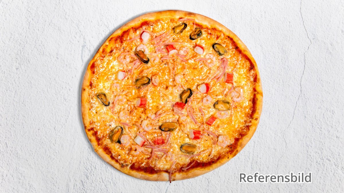 Tomatsås, ost, skinka, räkor, champinjoner, musslor och oliver.