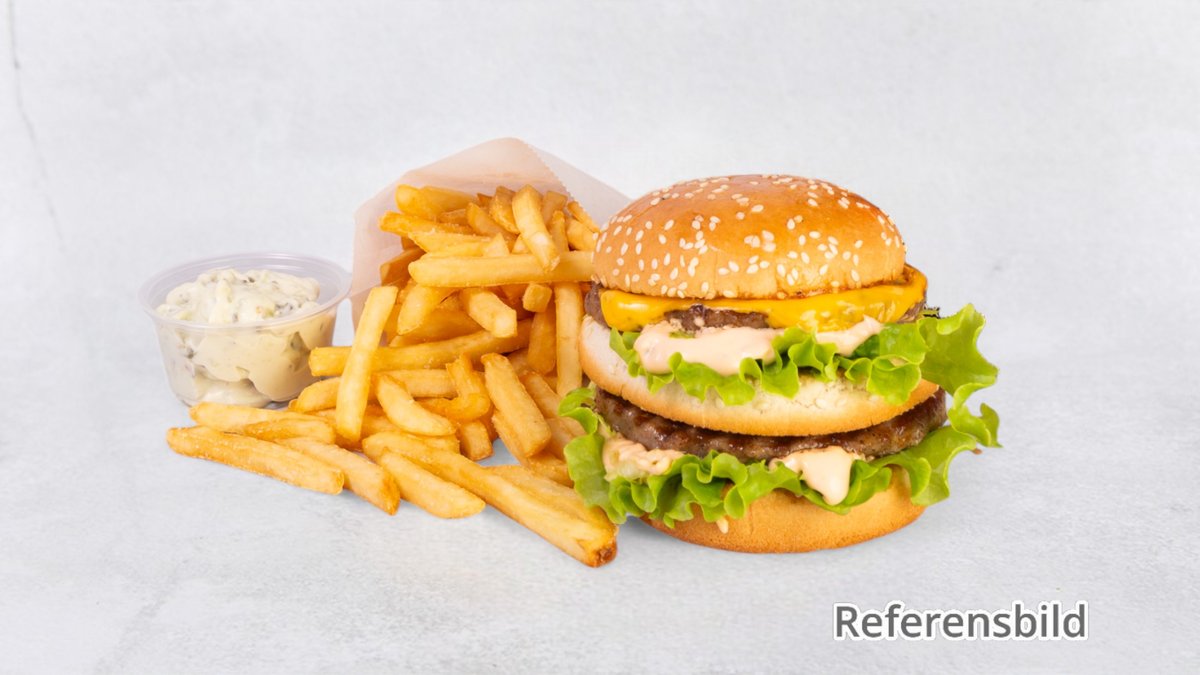 Inkl. 33 cl dryck. Pommes frites, hamburgerdressing och isbergssallad.