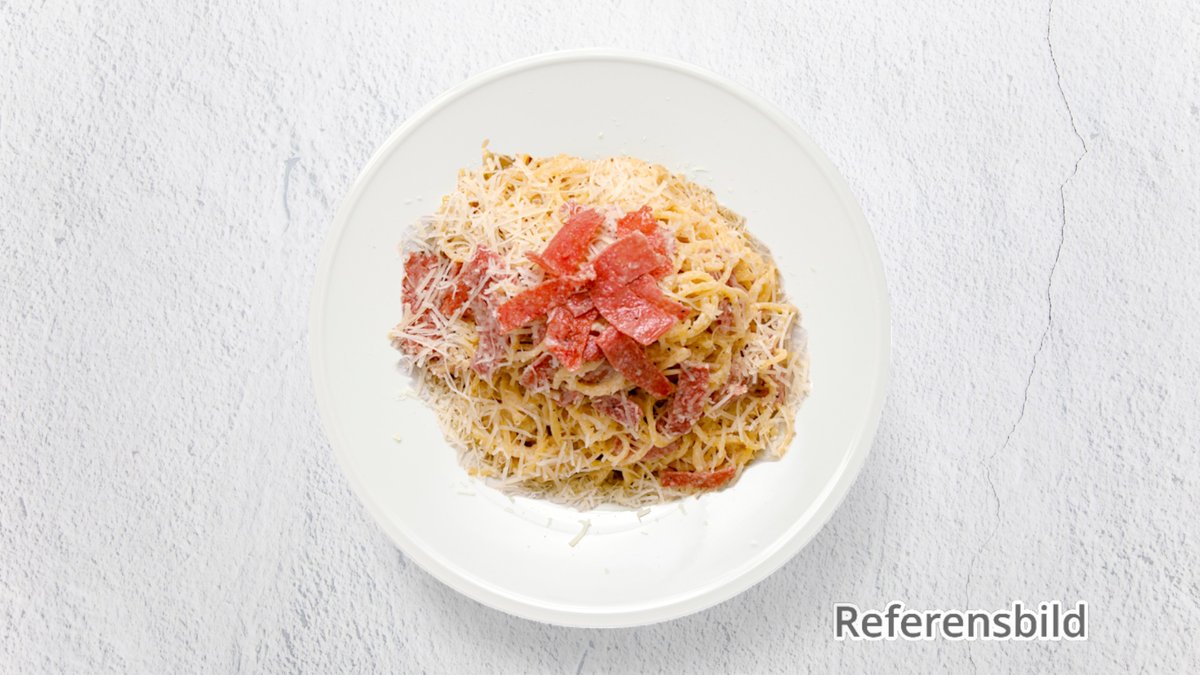 Pasta, ost, skinka, räkor, ananas, orientdressing (i burk), paprika, färska tomater, isbergssallad, gurka, citron och dill.
