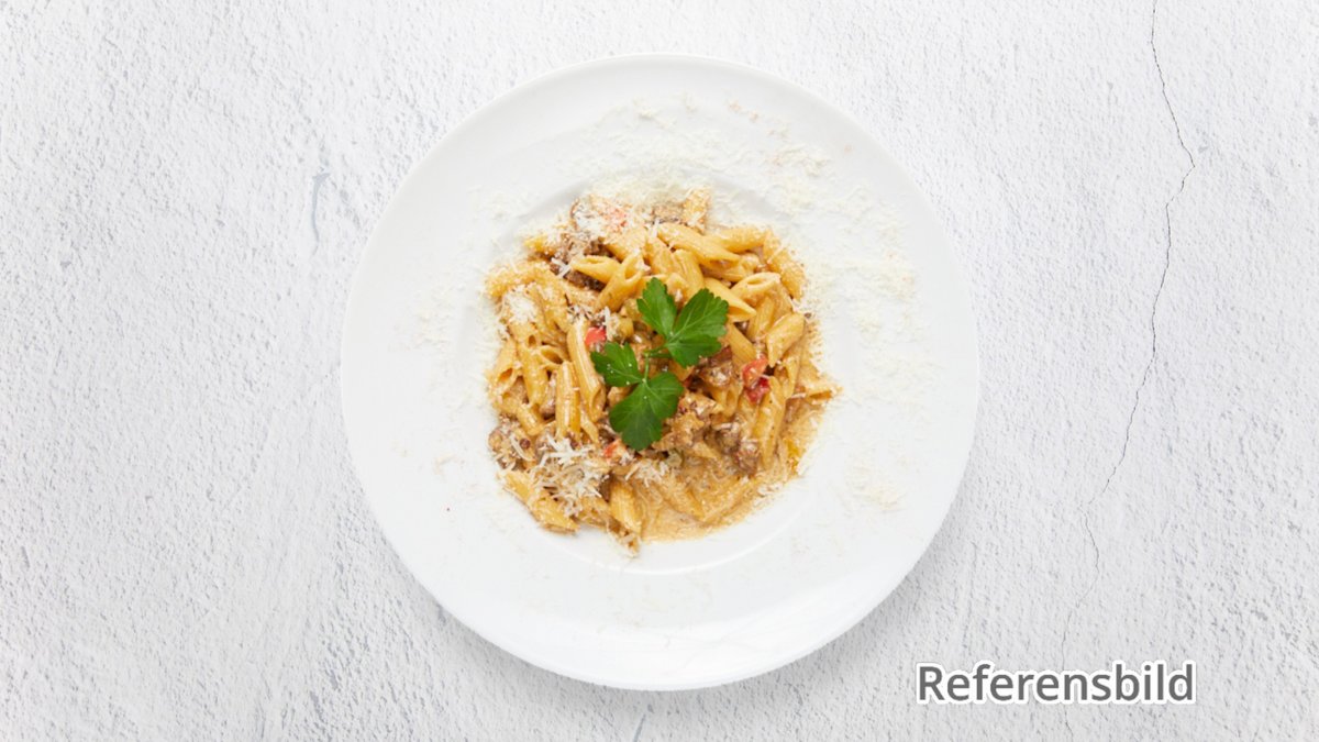 Pasta, ost, orientdressing (i burk), oliver, färska tomater, isbergssallad, gurka och rödlök.