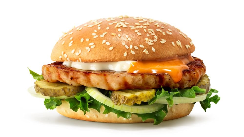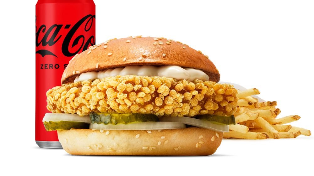 Marinerad och panerad svensk kycklingbröstfilé med gul lök, saltgurka, majonnäs och sesambröd. Serveras med tillbehör och dryck. 0,8 kg CO2e