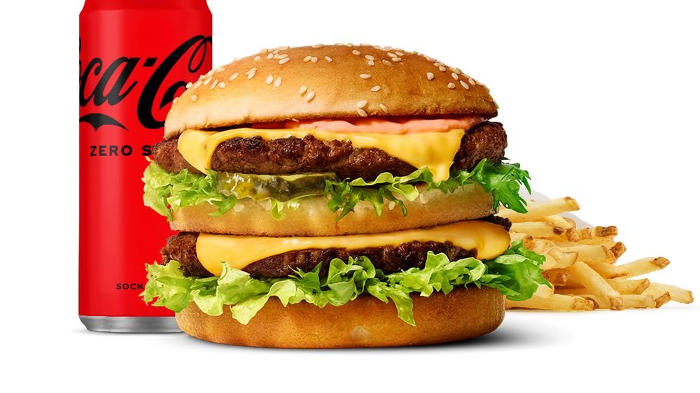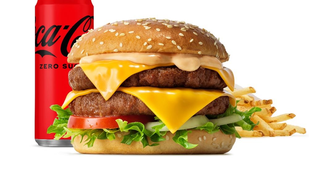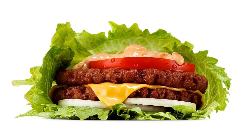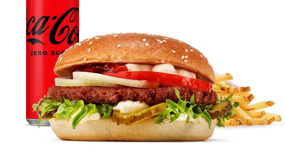 Dubbel växtbaserad burgare på sojaprotein med cheddarsmältost, tomat, gul lök, isbergssallad, originaldressing och sesambröd. Serveras med tillbehör och dryck. 1,2 kg CO2e
