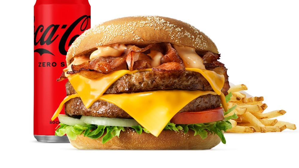 Burgare med svenskt nötkött, originaldressing, svenskt bacon, isbergssallad, gul lök, tomat, cheddarsmältost och sesambröd. Serveras med tillbehör och dryck. 4,6 kg CO2e