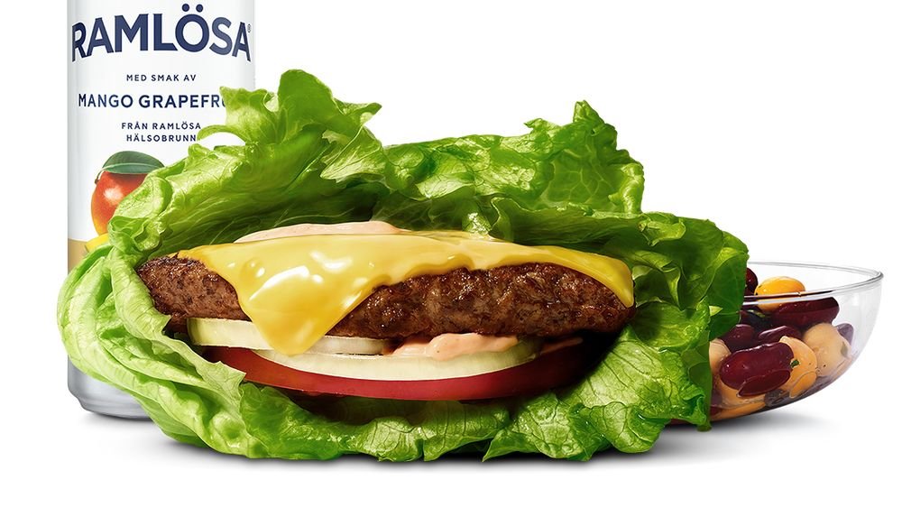 Burgare med svenskt nötkött, cheddarsmältost, isbergssallad originaldressing och sesambröd. Serveras med tillbehör och dryck. Plus en överraskning! 1,7 kg CO2e