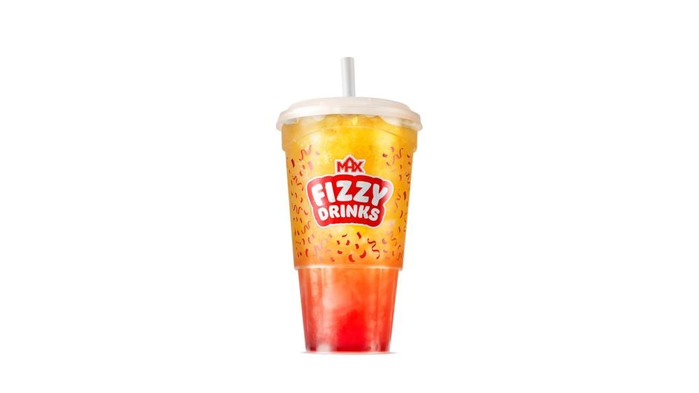 Fanta Apelsin blandat med is, jordgubbssyrup och lemonad. 0,1 kg CO2e.(Returmugg inkl pant 5 kr)