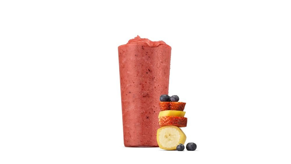 Jordgubb, banan, blåbär och äppeljuice. 0,7 kg CO2e