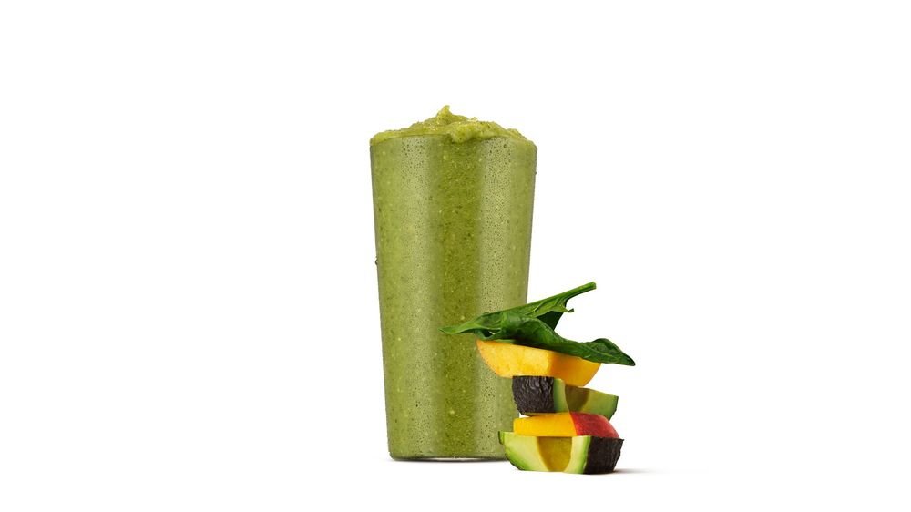 Avokado, spenat, mango, ananas och äppeljuice. 0,6 kg CO2e