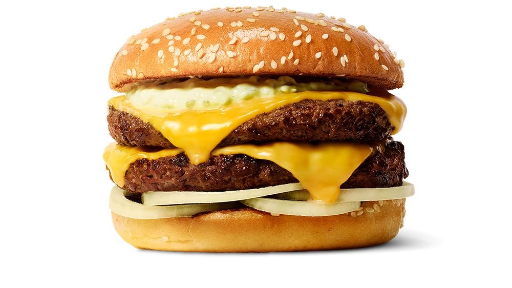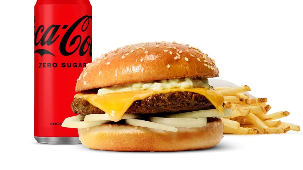 Dubbel växtbaserad burgare på sojaprotein med cheddarsmältost, tomat, gul lök, isbergssallad, originaldressing och sesambröd. Serveras med tillbehör och dryck. 1,2 kg CO2e