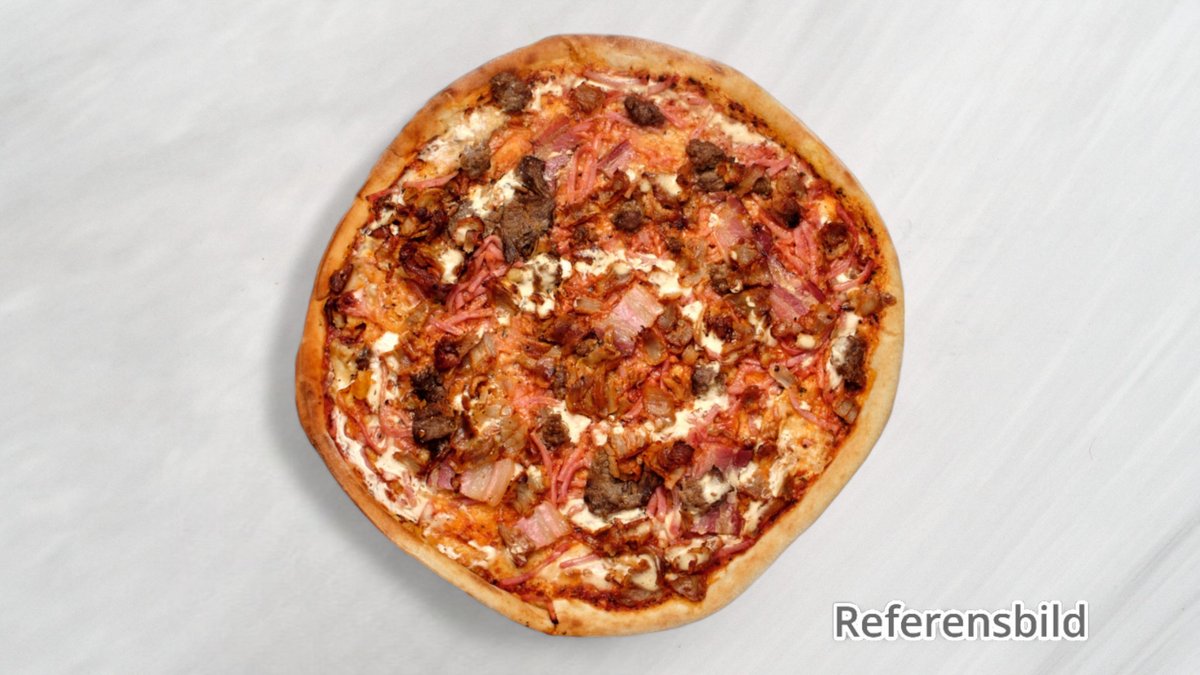 Tomatsås, ost, kebabkött, skinka, lök, champinjoner och valfri sås.
