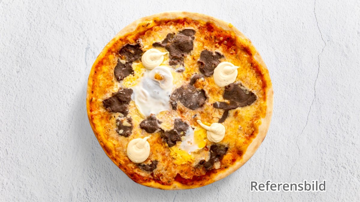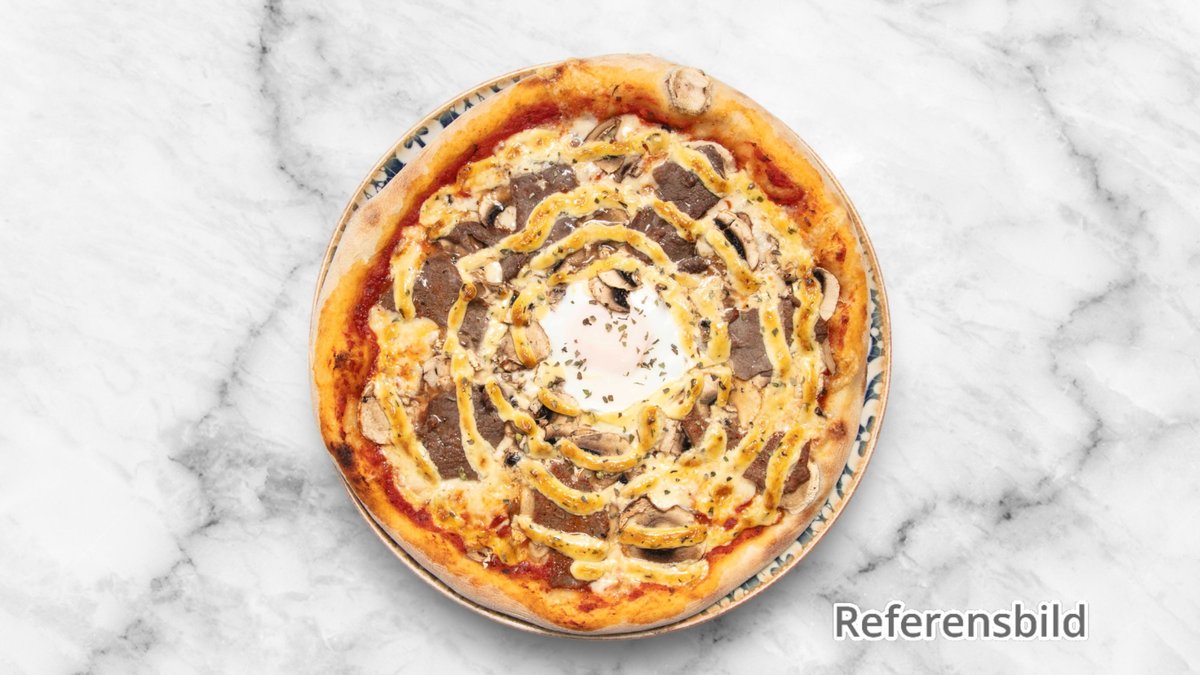 Tomatsås, ost, oxkött, skinka, gorgonzola och bearnaisesås.