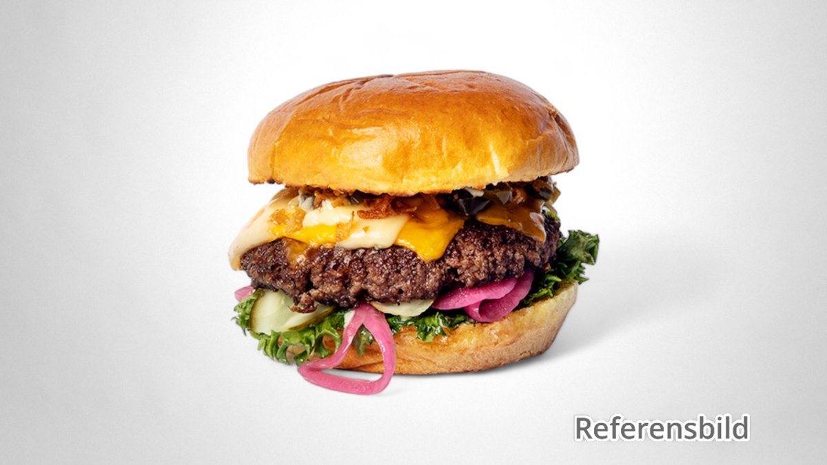 Saftig hamburgare med ost, sallad, tomat och dressing i ett mjukt bröd.