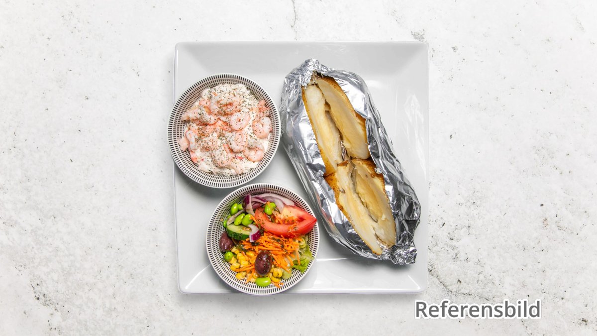 Serveras med sallad, tomater, gurka, ananas och paprika.