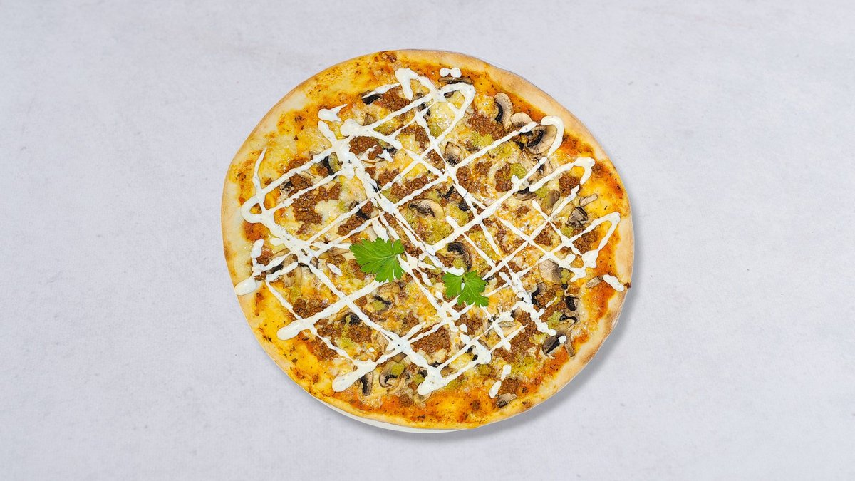 Tomatsås, ost, köttfärs, champinjoner, vitlök och bearnaisesås.