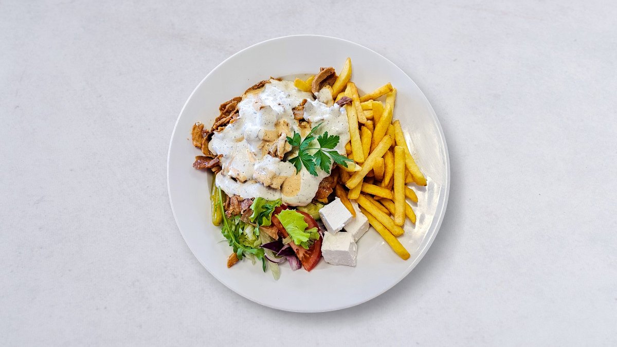 Kebab med kebabkött, sallad, tomat, gurka, lök, feferoni, pommes och valfri sås.