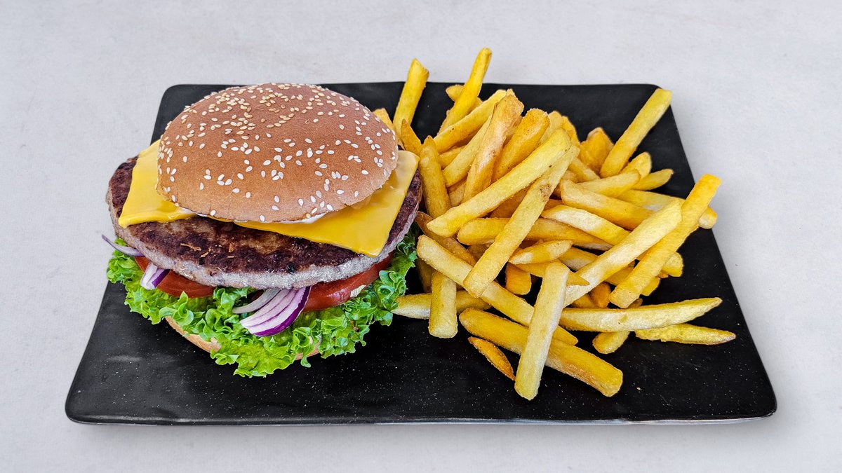 Burgare med pommes, bröd, sallad, dressing och 33 cl dryck.