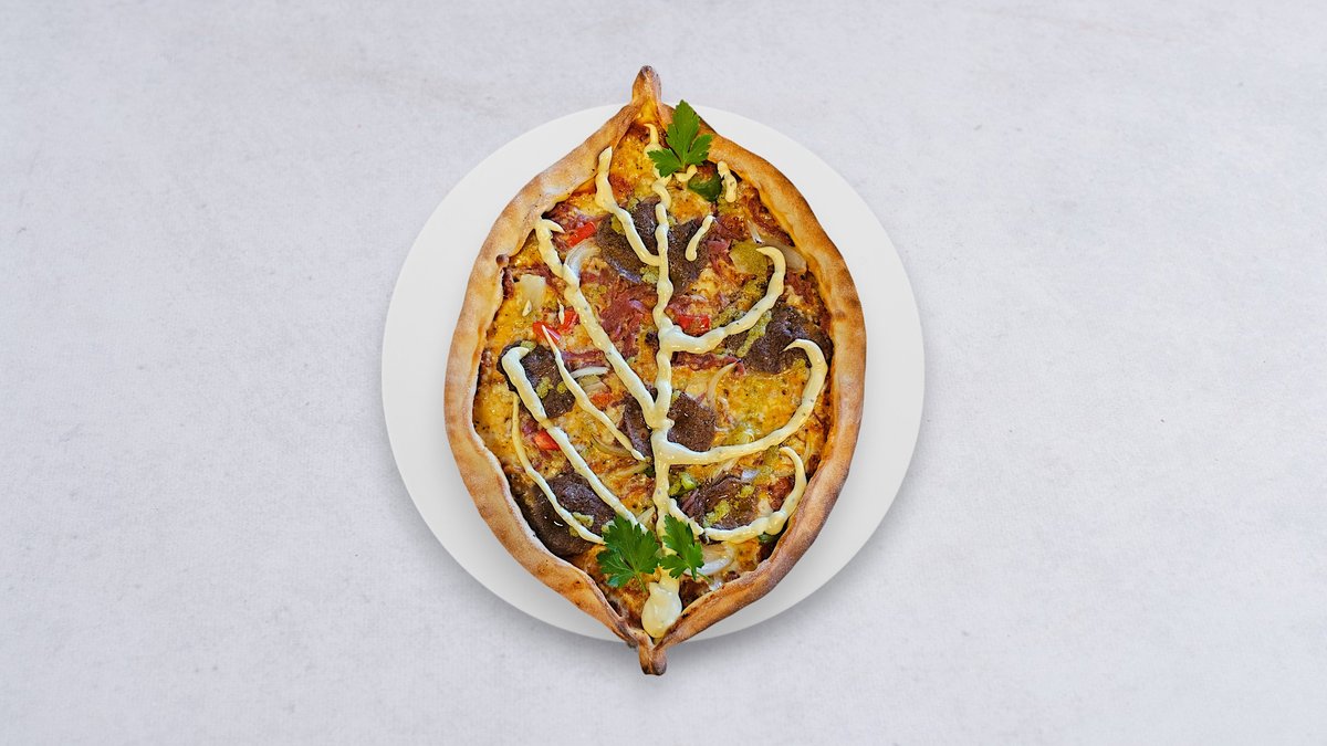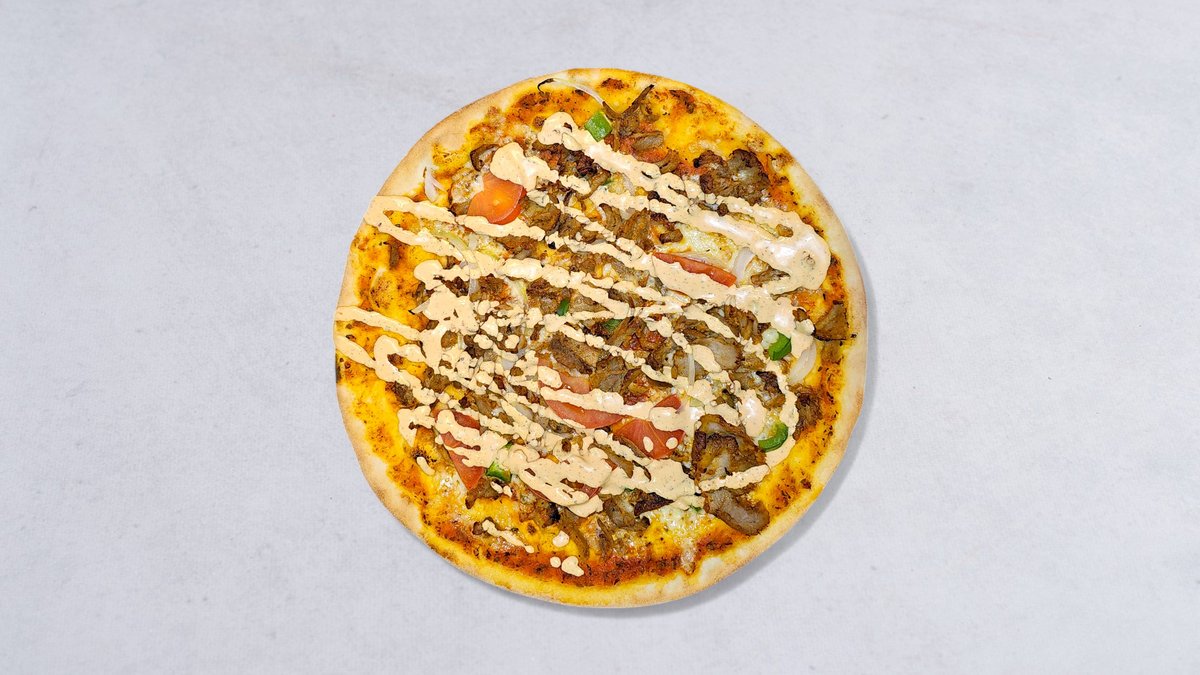 Tomatsås, ost, kebabkött, feferoni och valfri sås.