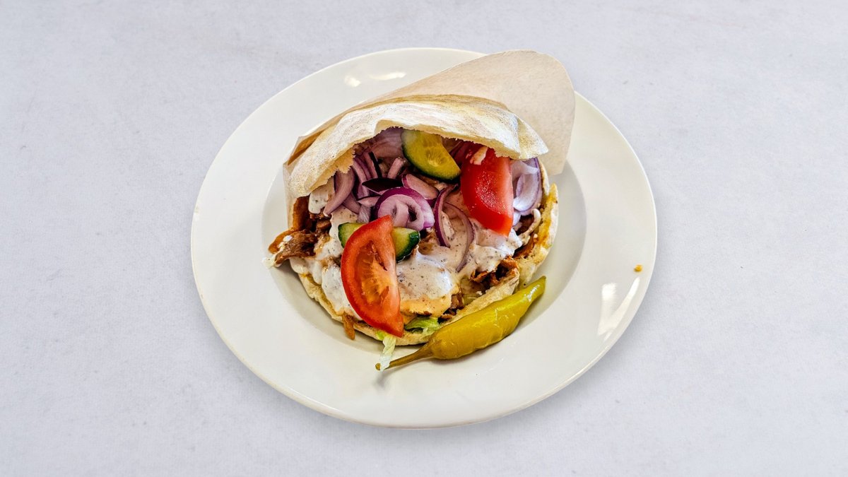 Kebab med skuret bröd, kebabkött, sallad, tomat, gurka, feferoni, lök och valfri sås.