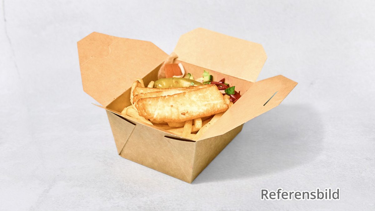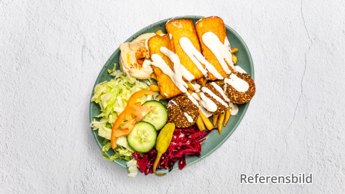Pommes, grönsaker, 3 bitar falafel och 5 bitar halloumi.
