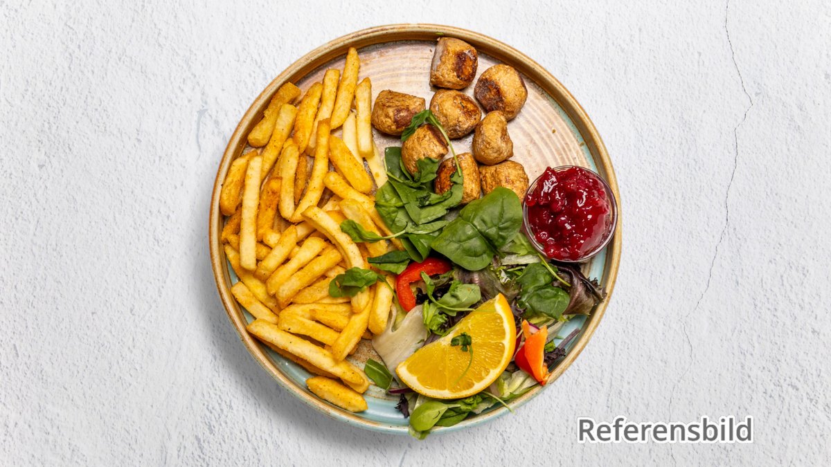 Pommes, grönsaker och 7 vegetariska vårrullar.