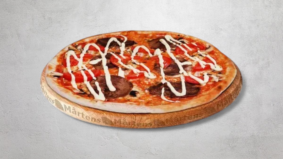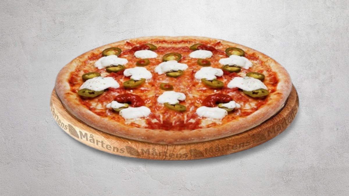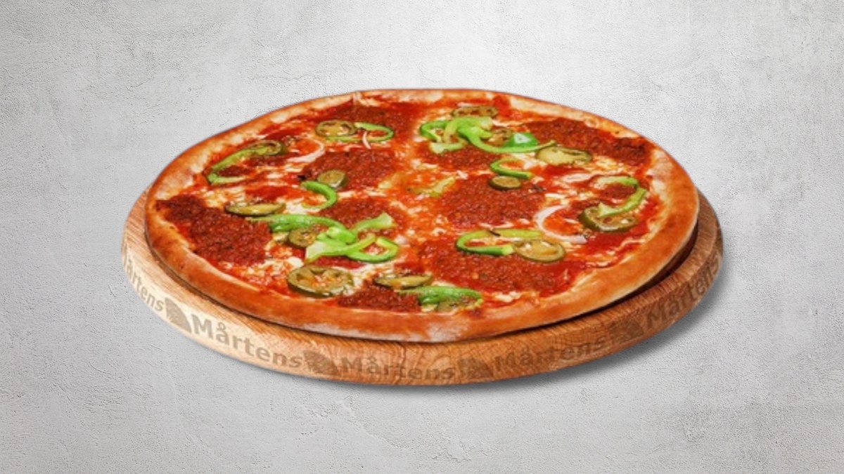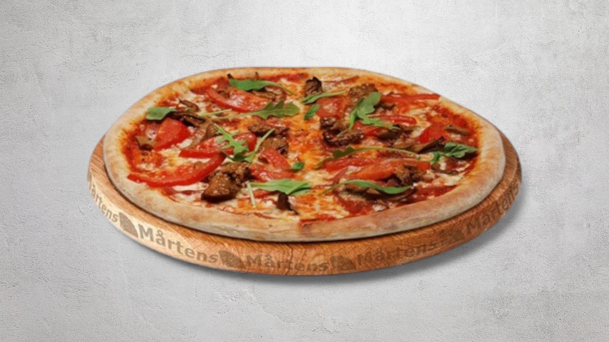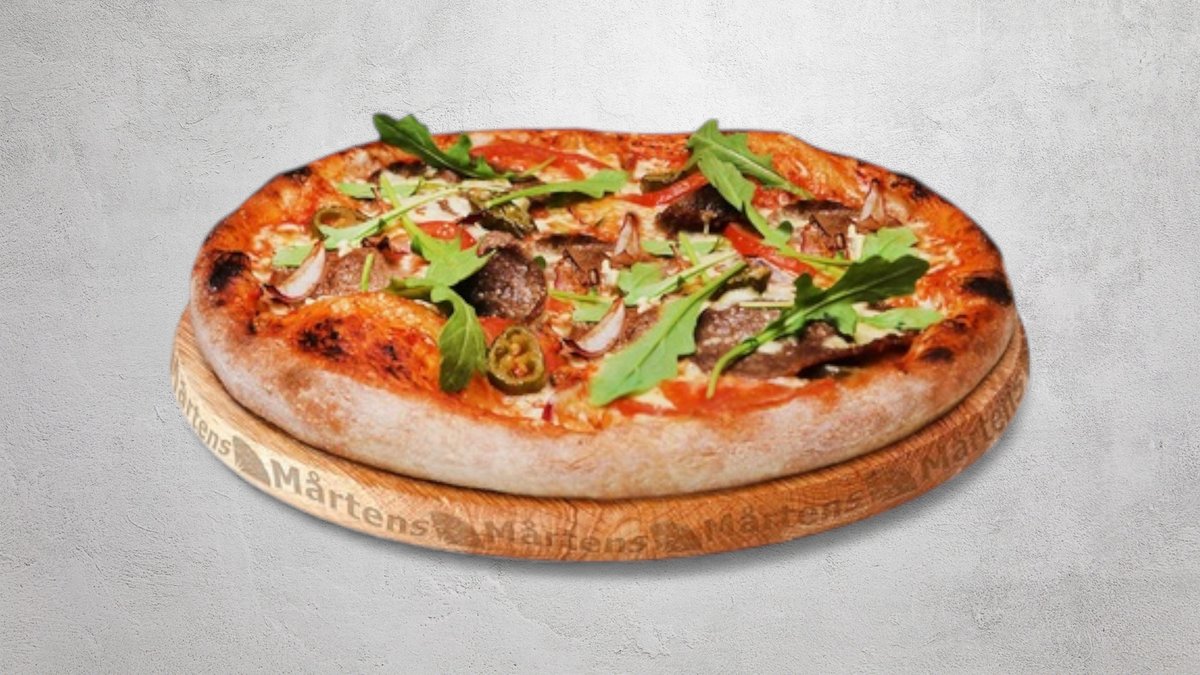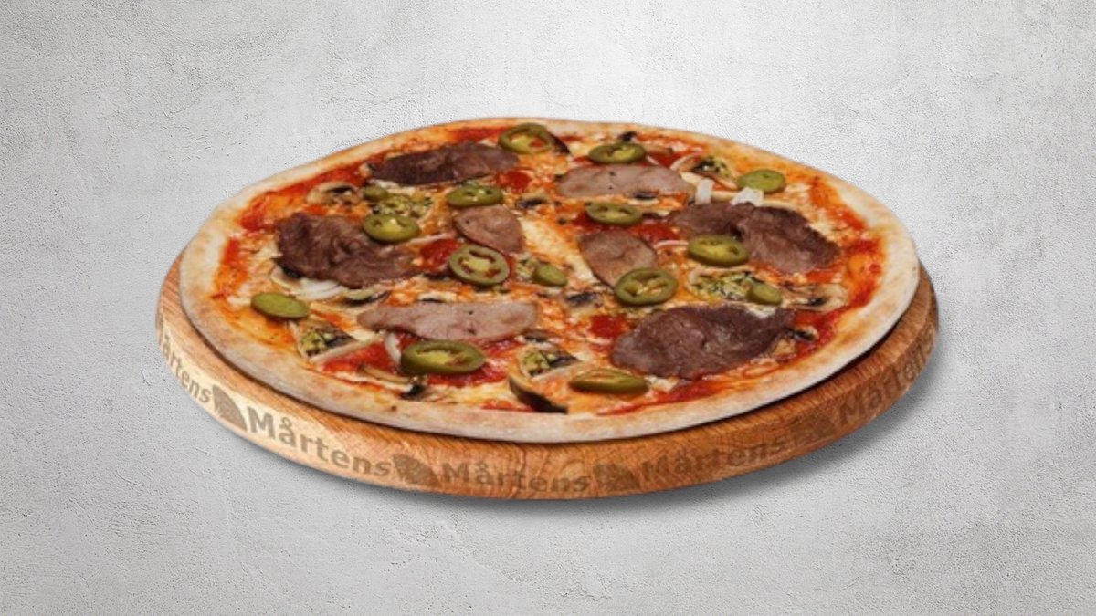 Tomatsås, ost, mozzarellaost, oxfilé, tomater, jalapeño och rödlök.