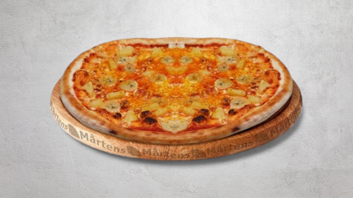 Tomatsås, ost, ananas, banan, jordnötter och curry.