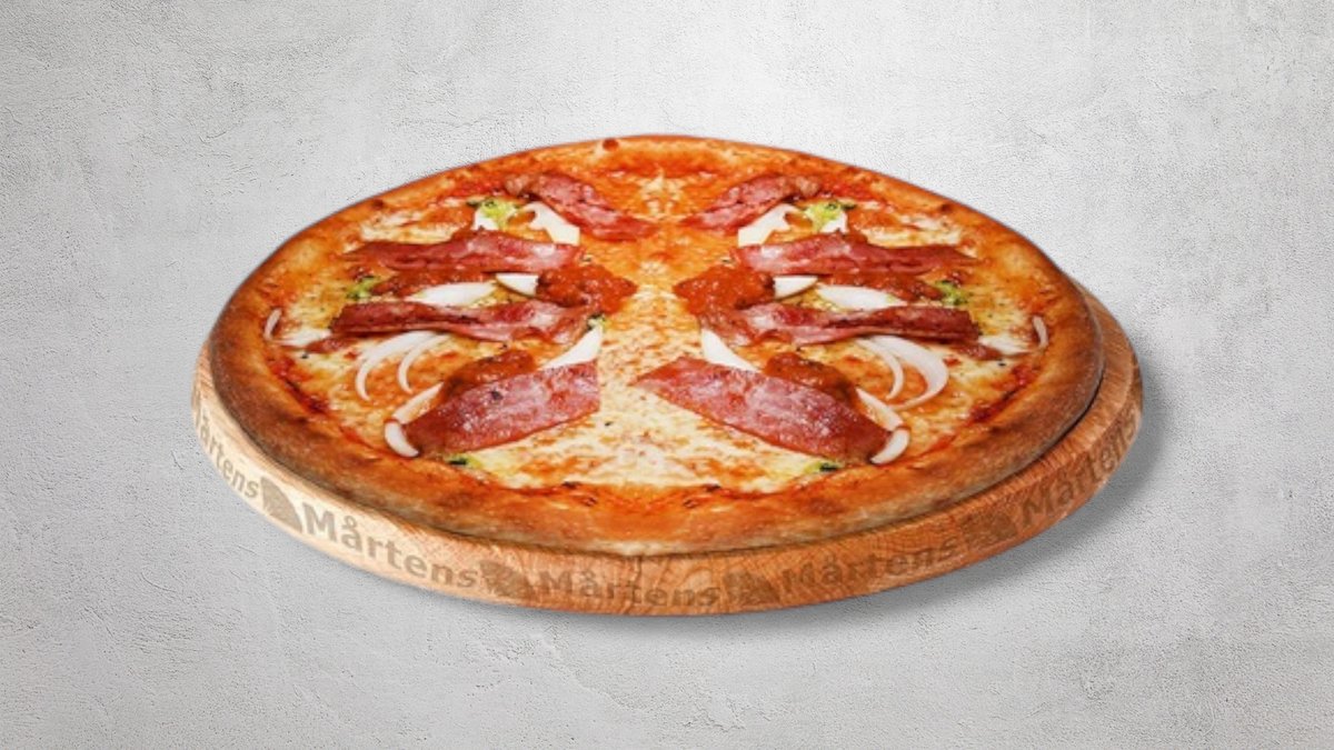 Tomatsås, ost, mager ost, köttfärs, salami, bacon, tomater och champinjoner.