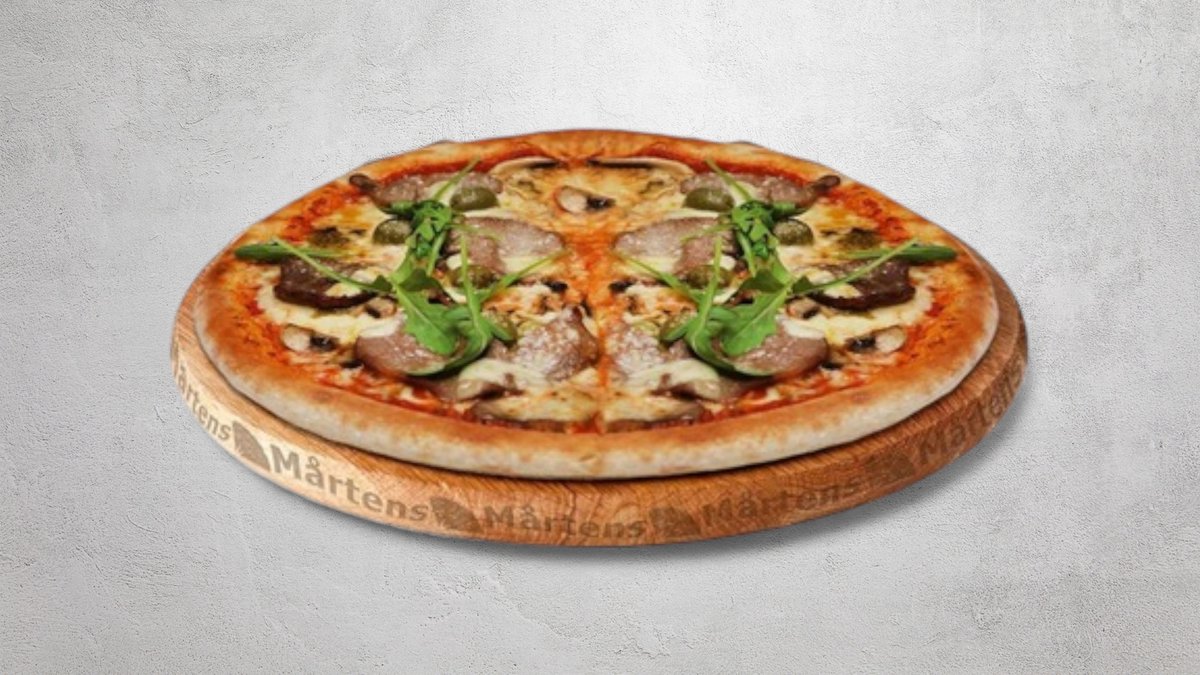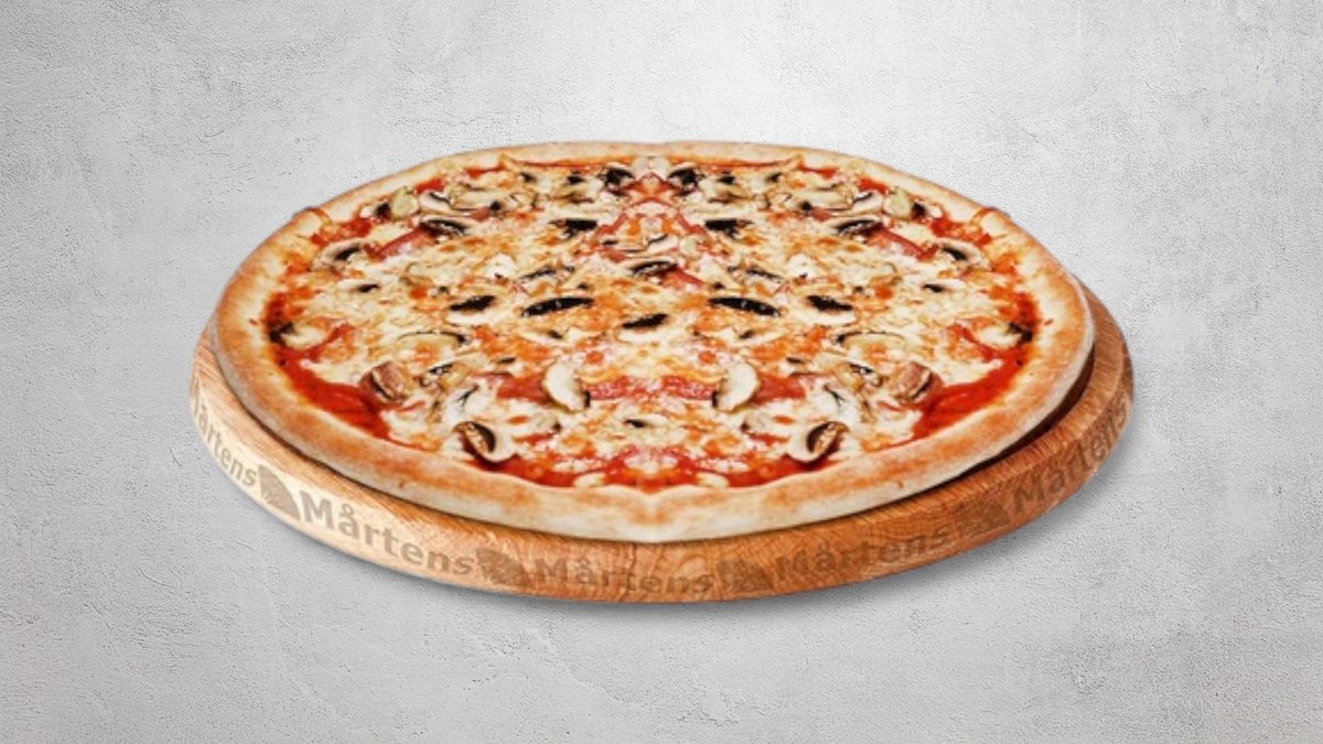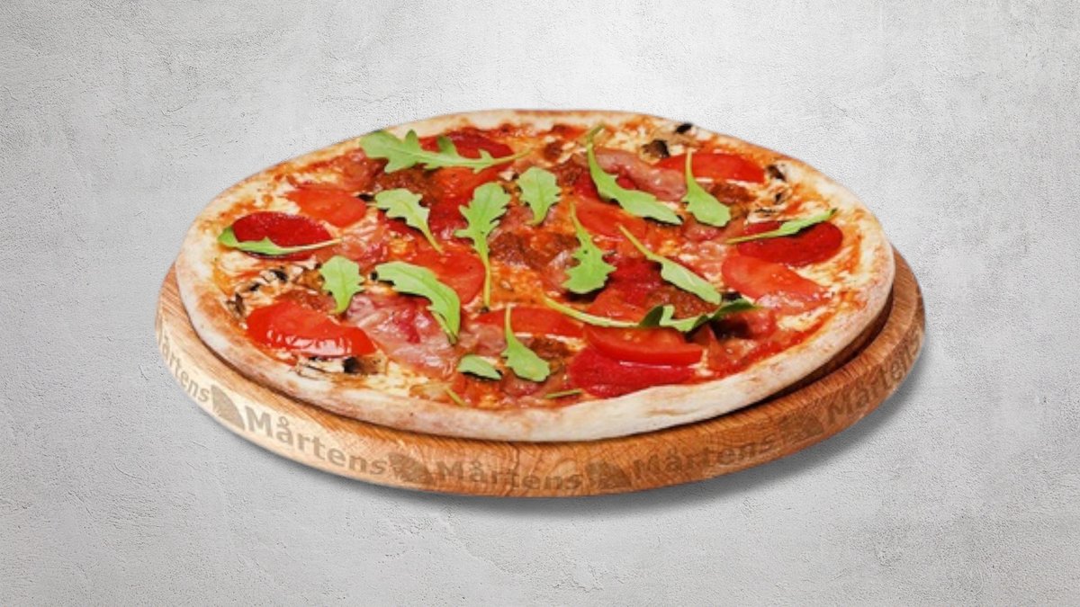 Tomatsås, ost, skinka, räkor och svamp.