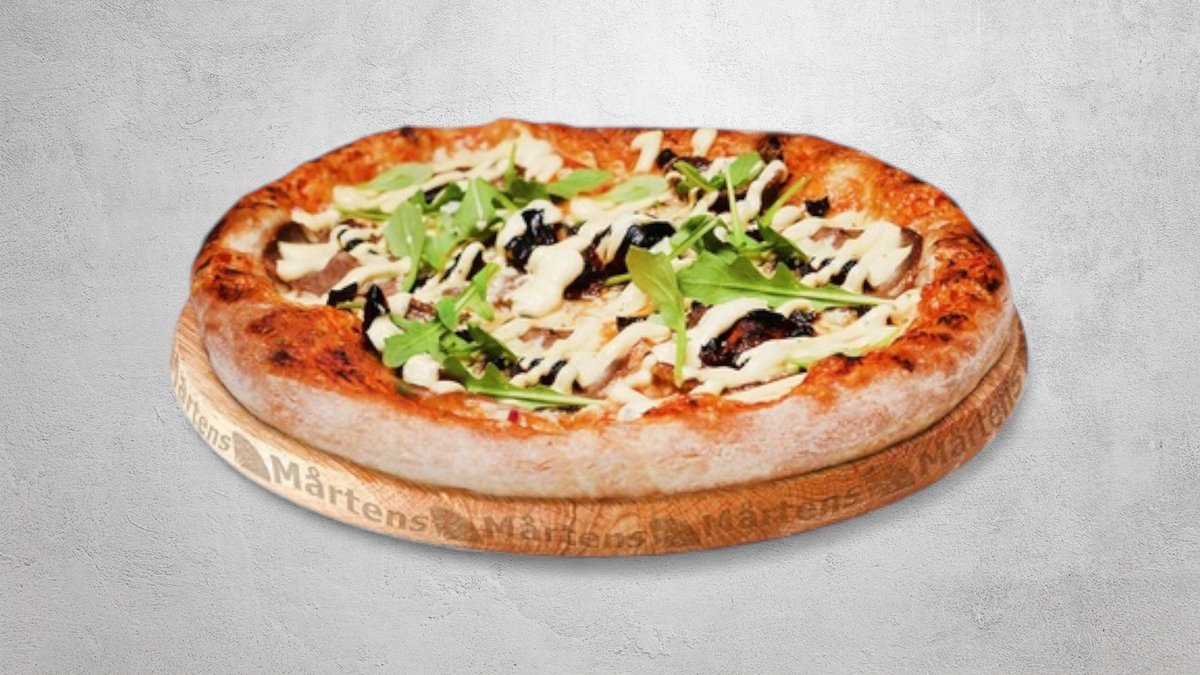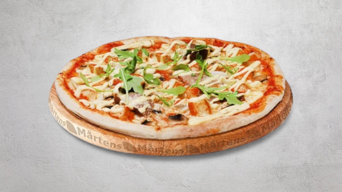 Tomatsås, ost, mozzarellaost, kyckling, oxfilé, ruccolasallad, lök, champinjoner och bearnaisesås.