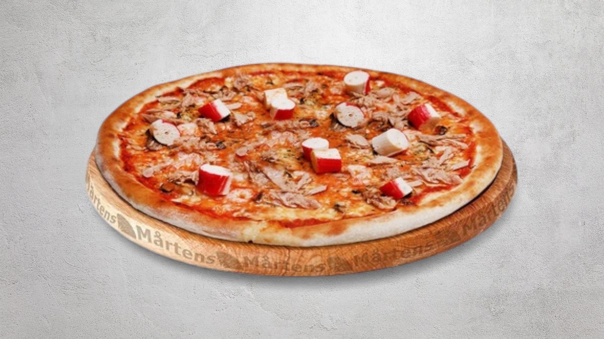 Tomatsås, ost, tonfisk, krabba, räkor och musslor.