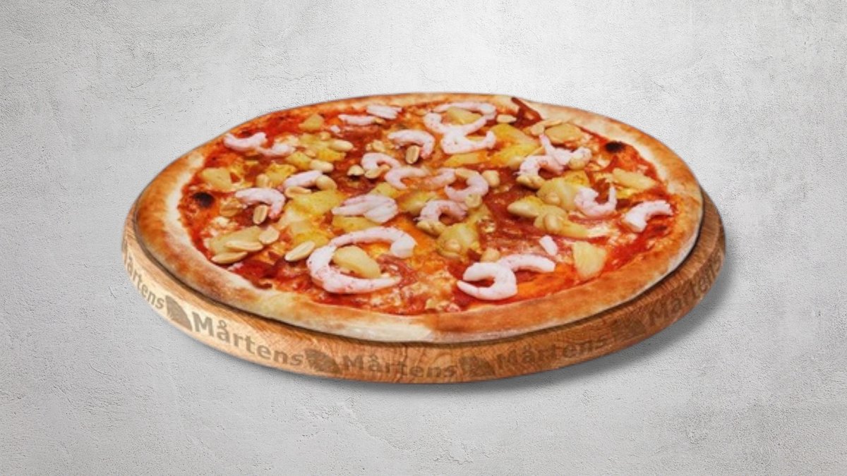 Tomatsås, ost, skinka, räkor, ananas, jordnötter och curry.