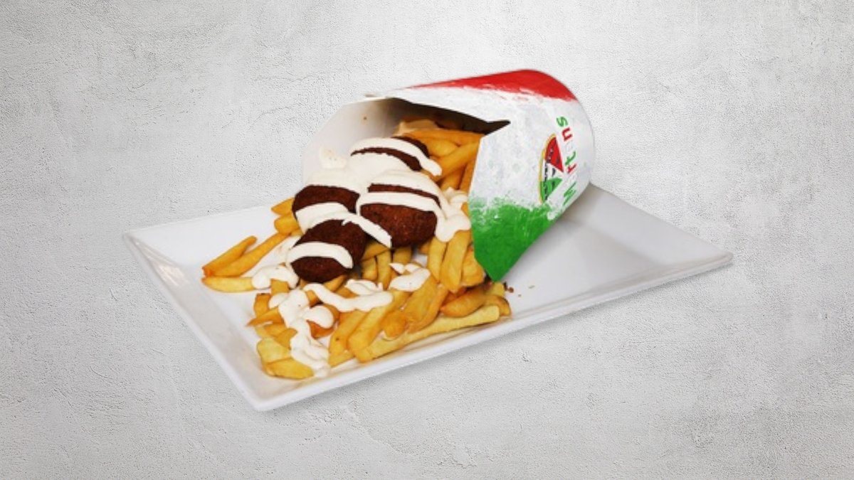Falafel, med feferoni och mild sås. Serveras med pommes frites. Välj sås i nästa steg.
