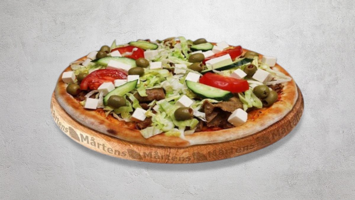 Tomatsås, ost, fetaost, kebabkött (nötkött), sallad, gurka, tomater och oliver.
