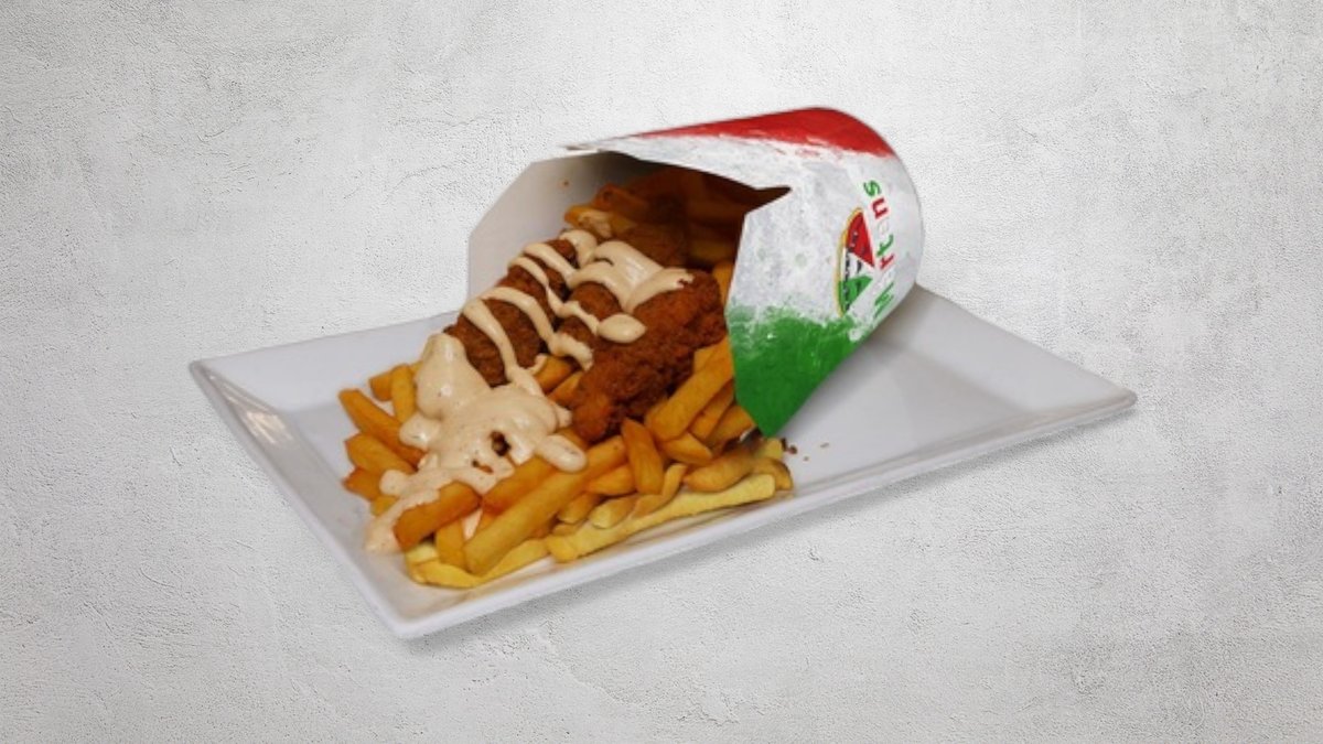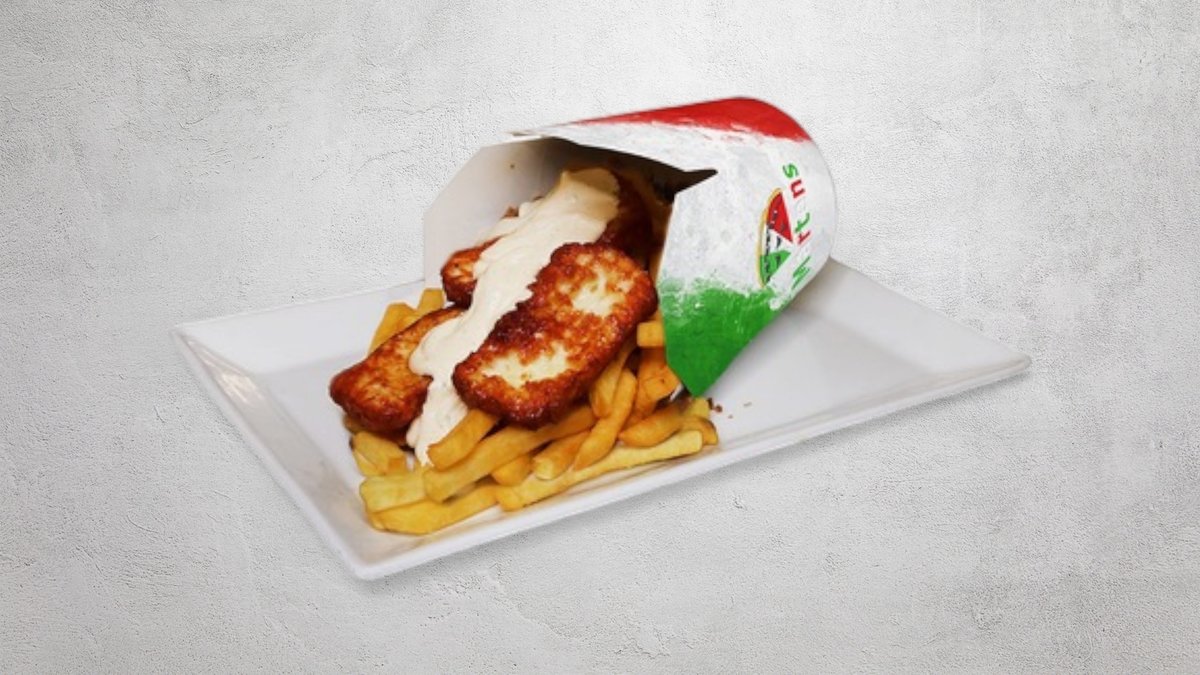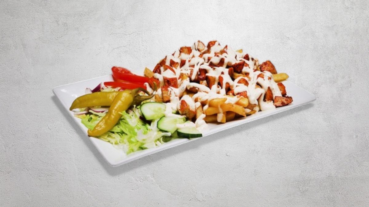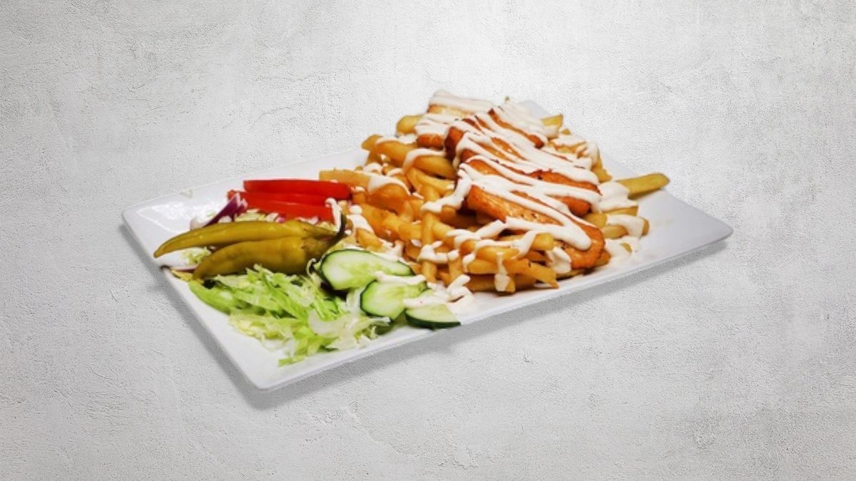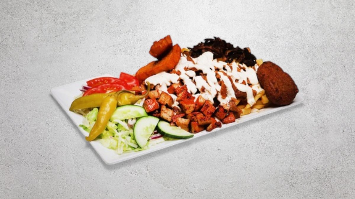 Kyckling, kebab, shawarma, falafel och halloumi. Serveras med pommes frites. Välj sås i nästa steg.