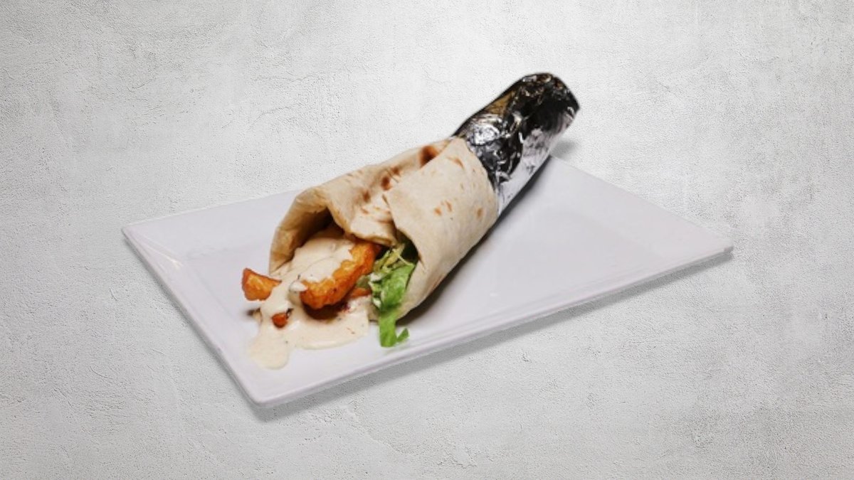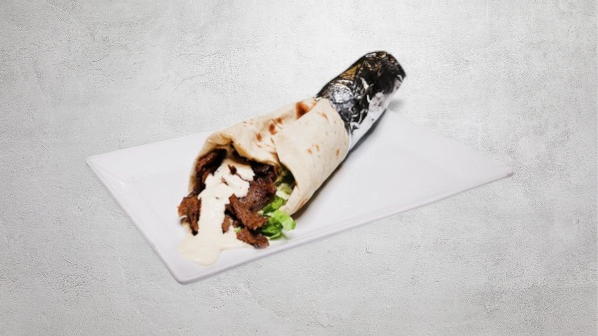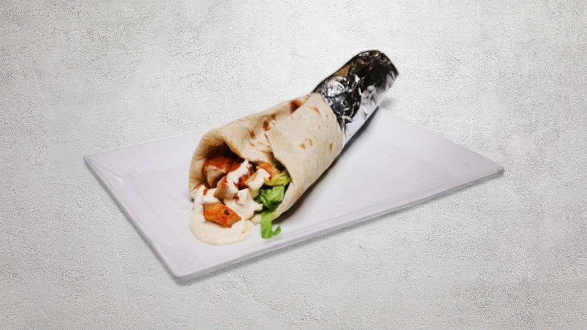 Shawarma med sallad, tomater, gurka, lök och feferoni. Välj sås i nästa steg.