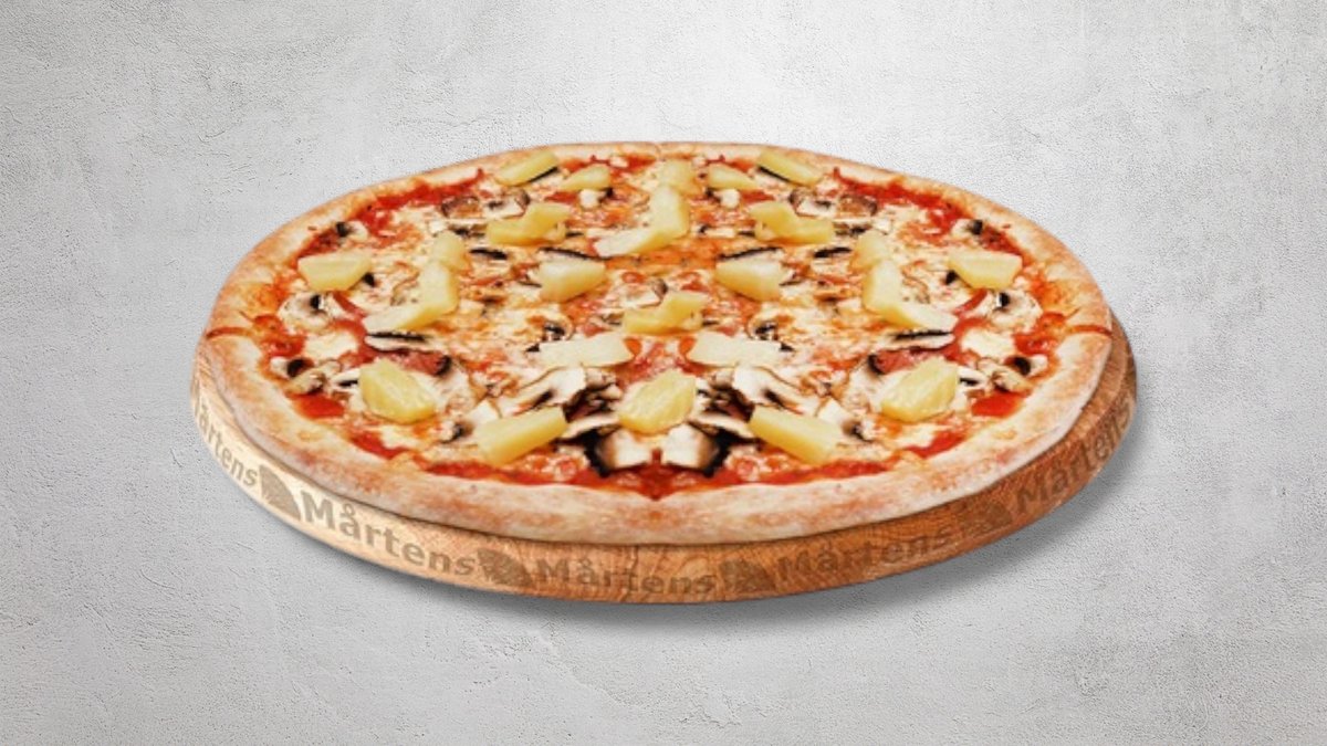 Tomatsås, ost, skinka, ananas och champinjoner.