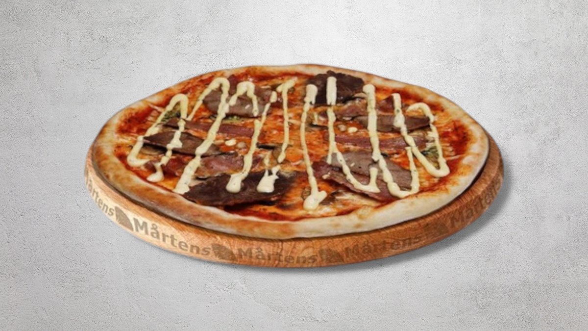 Tomatsås, ost, oxfilé, bacon, champinjoner, vitlök och bearnaisesås.