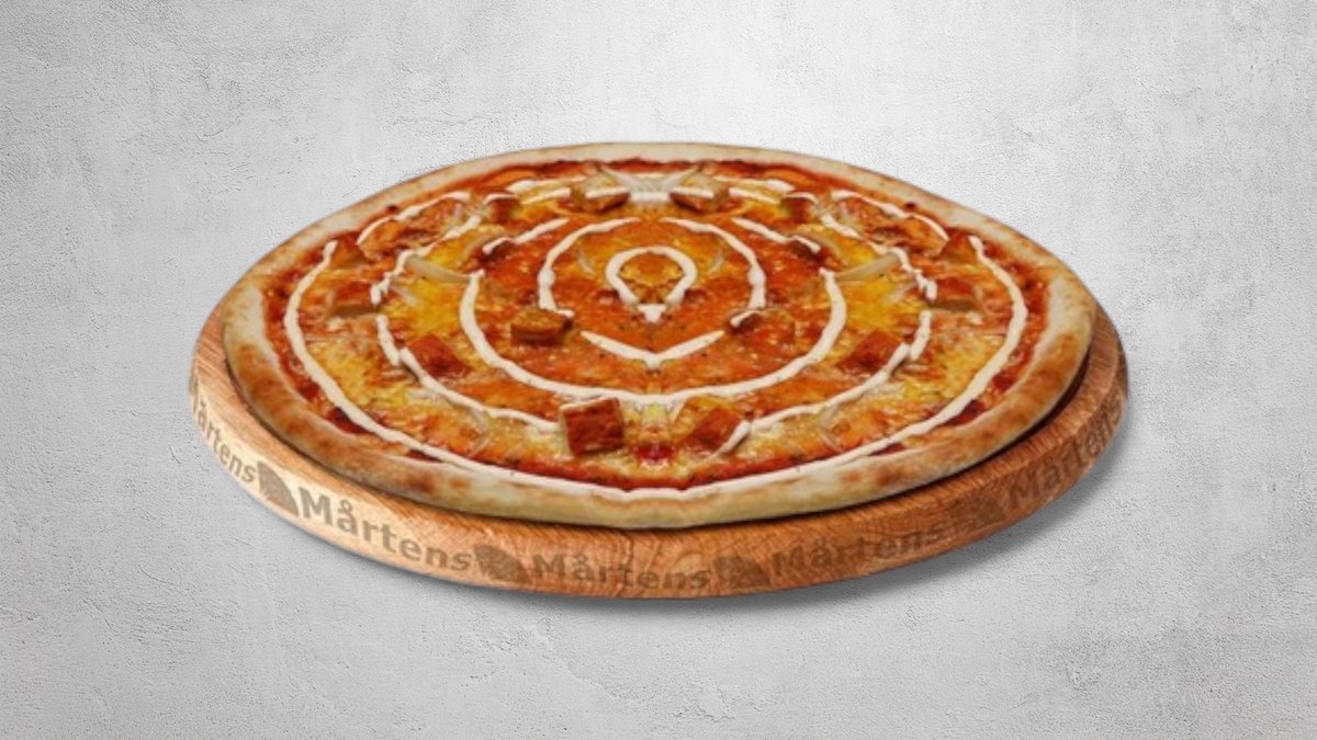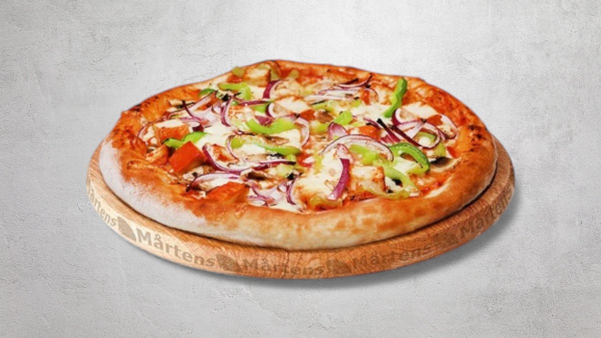 Tomatsås, ost, mozzarellaost, kyckling, bacon, paprika, ananas, jalapeño och rödlök.