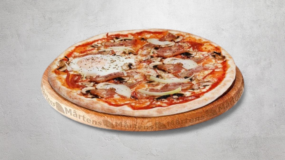 Tomatsås, ost, skinka, bacon, ägg, lök, champinjoner och svartpeppar.