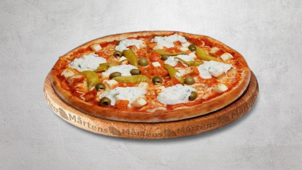Tomatsås, ost, fetaost, kyckling, feferoni, oliver och tzatziki.