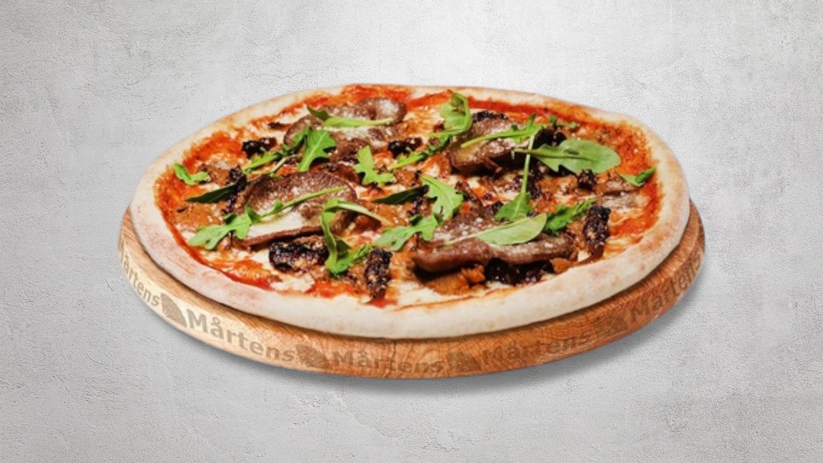 Tomatsås, ost, mozzarellaost, parmesanost, oxfilé, kantareller och soltorkade tomater.
