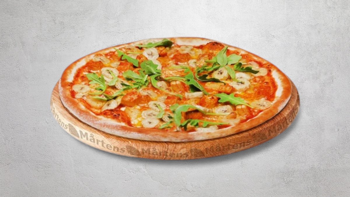 Tomatsås, ost, mager ost, kyckling, ananas, banan, jordnötter och curry.