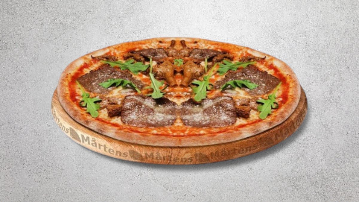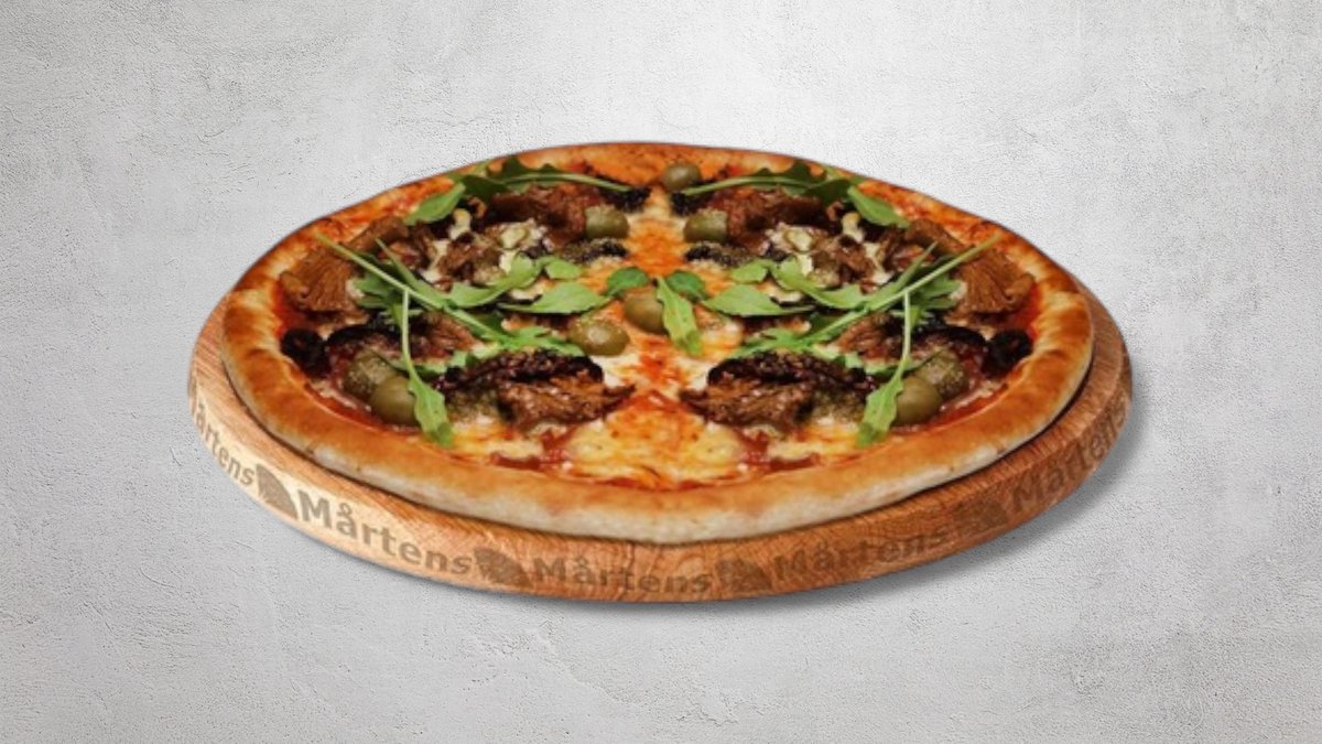 Tomatsås, ost, mozzarellaost, oxfilé, ruccola, soltorkade tomater och bearnaisesås.