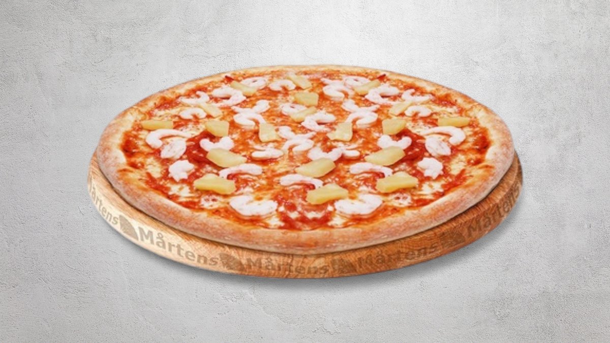 Tomatsås, ost, skinka, ananas och räkor.