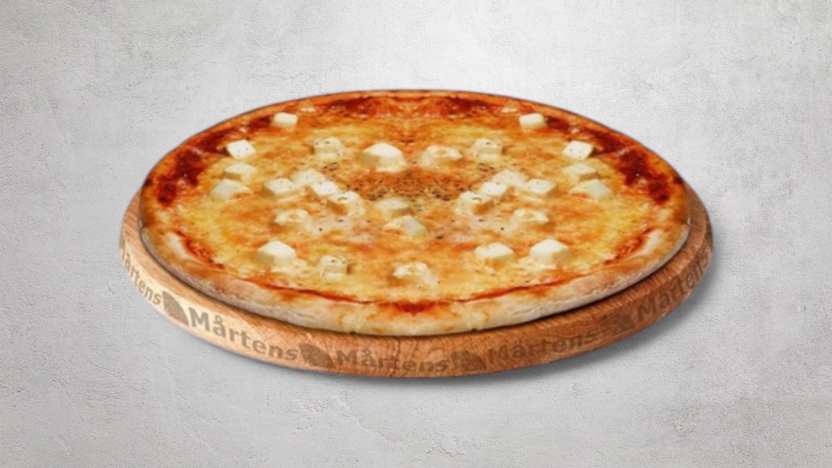 Tomatsås, ost, gorgonzolaost, mozzarellaost, fetaost och parmesanost.